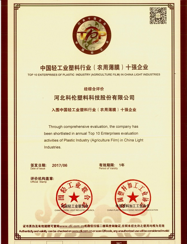 日前,經過中國輕工業聯合會和中國塑料加工工業協會聯合層層評選,科倫股份被評為“中國輕工業塑料行業(農用薄膜)十強企業”,彰顯了科倫股份在引領行業發展方面做出的貢獻。